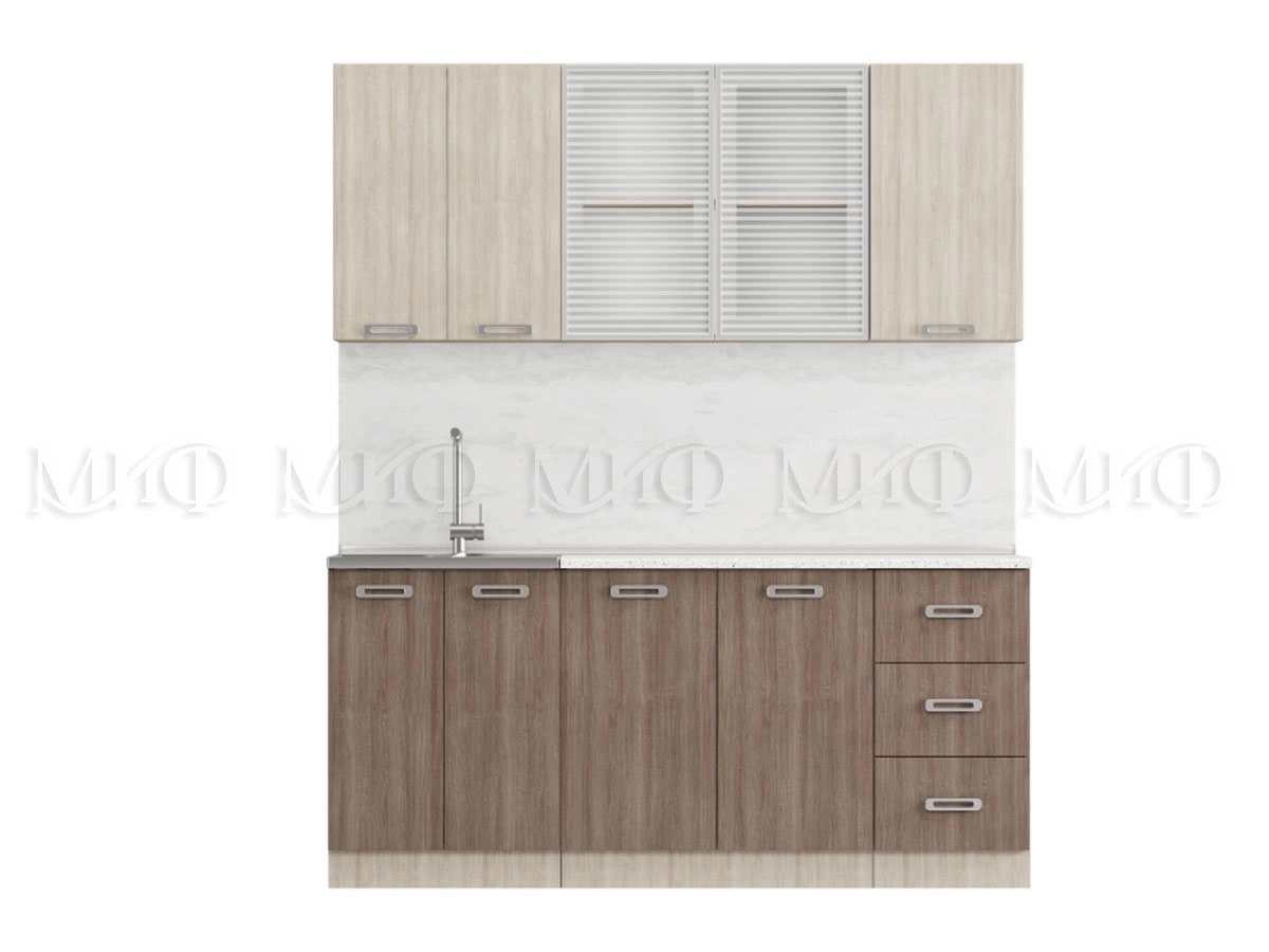 Кухонный гарнитур имеет интересные стеклянные створки, напоминающие чем-то жалюзи. Один из нижних модулей рассчитан под накладную мойку и не оснащен столешницей, которую можно приобрести отдельно.