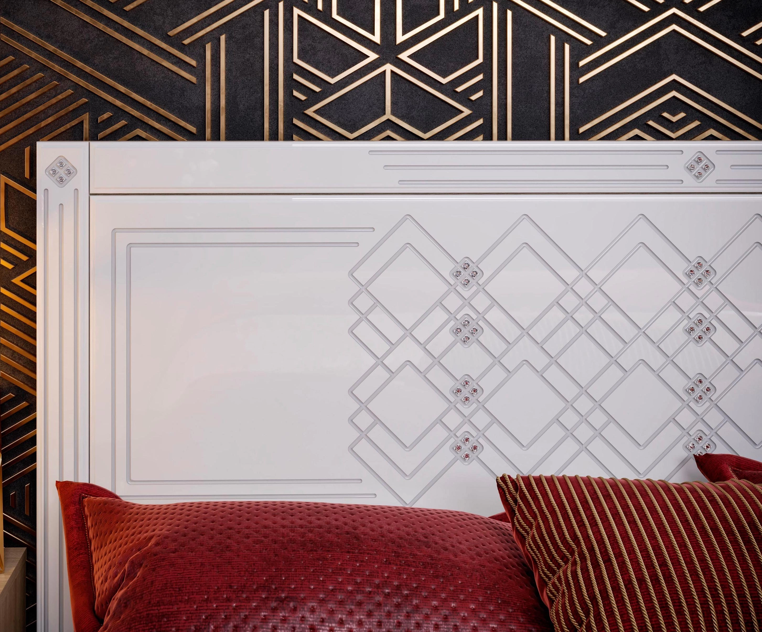 - Фасад модульной спальни выполнен из МДФ облицованного пленкой ПВХ Белый глянец.