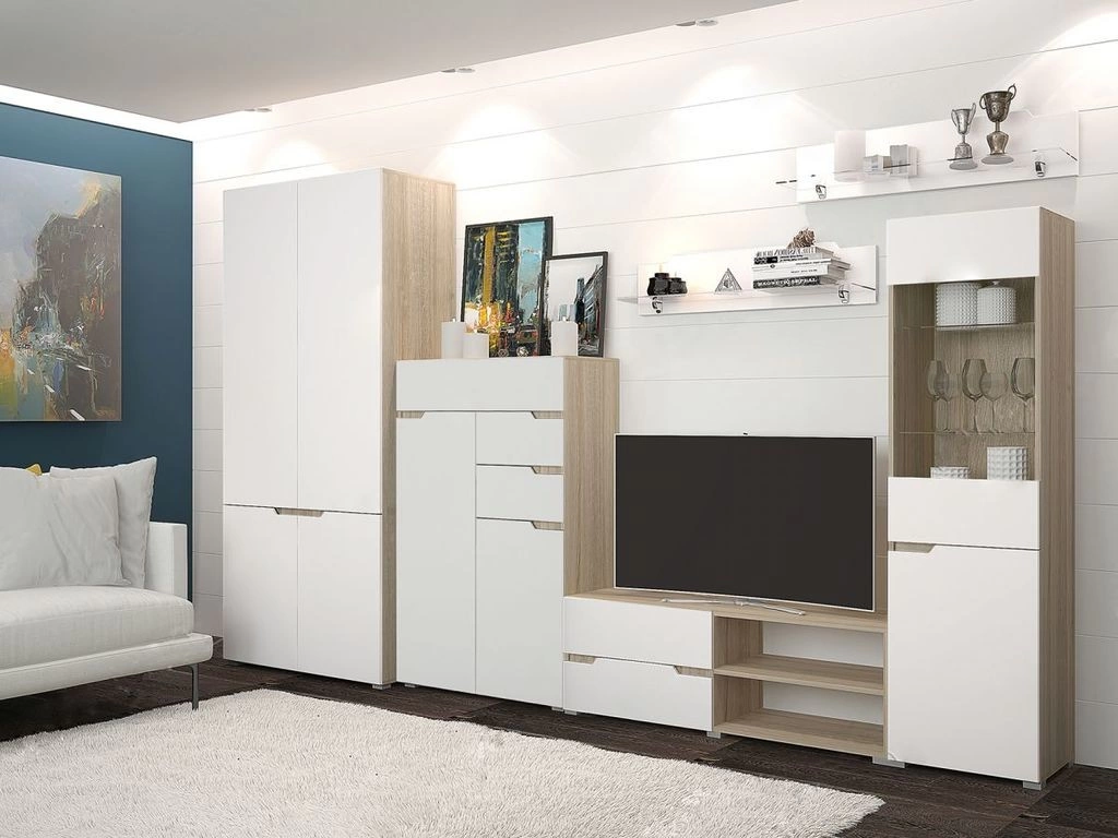- Набор состоит из 2х ств. шкафа, Тумбы и Пенала. Гостиную можно доукомплектовать комодом и навесными полками.